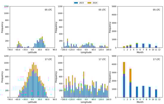 Data collected between 1 January 2023 and 15 May 2024 were used for matching, resulting in matched sample sizes of 2479 at 0500 LT and 11,595 at 1700 LT, respectively. Figure 3 illustrates the distribution of the matched samples according to LT, latitude, longitude, and month of the year. The longitudinal distribution shows no significant variation, while the 0500 LT samples are primarily concentrated in the middle latitude band, and the 1700 LT samples are mostly distributed around the equator, with a secondary concentration in the middle latitudes comparable to the 0500 LT distribution, providing an opportunity for further comparative analysis between these two time periods. Regarding monthly distribution, the 0500 LT samples show relatively consistent sample sizes across months, albeit with some gaps, while at 1700 LT, the samples are limited to the first five months of 2024, with higher sample counts exhibited in January and February compared to the subsequent months.