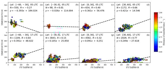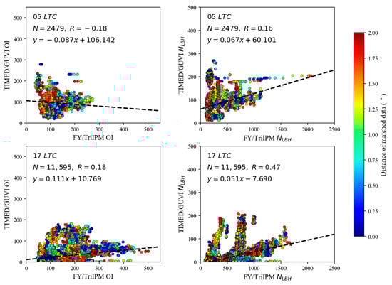 Comparison of matched samples between TriIPM and GUVI at 0500 LT and 1700 LT. The colors of data points indicate the horizontal distances between matched observations in degrees.