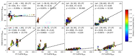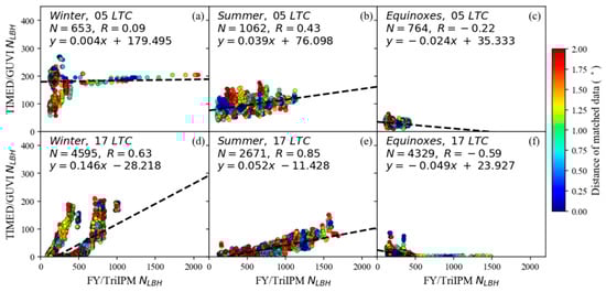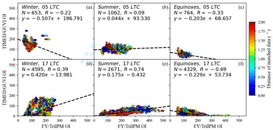 Due to the significant seasonal characteristics of fluctuations in the thermosphere and ionosphere, we conducted a seasonal analysis of the matched samples. In this paper, we divide the matched samples into three segments: winter (January, February, November, and December), summer (May–August), and equinoxes (March, April, September, and October). Figure 7 and Figure 8 show the seasonal variations of the OI 135.6 nm and LBH radiances correlations between TriIPM and GUVI at 0500 LT and 1700 LT, respectively.