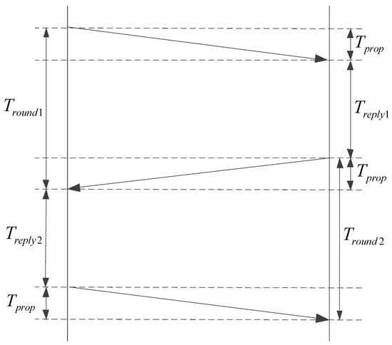 where and represent the time it takes a signal to travel back and forth between the positioning tag and base station, and represent the response time, represents the signal propagation time. Considering the whole process of information exchange, the following equations can be obtained: