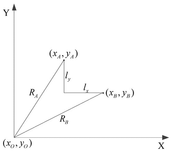 where represent the fusion ranging result from the unmanned vehicle to the base station at time A, and represent the fusion ranging result from the unmanned vehicle to the base station at time B. The position coordinates of A and B satisfy the following relation:
