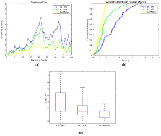 The size and cumulative distribution of positioning errors are shown in Figure 8a–c, respectively.
