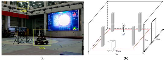 The indoor scene positioning test was conducted at the artificial intelligence navigation test field of 54 Institute of China Electrical Science and Technology in Shijiazhuang city. The test site measured 25 m by 25 m with a height of 5 m, and the autonomous vehicle followed a predetermined path within a red rectangular boundary on the test site. The UWB base station was located at the center of the red rectangular enclosure, with an antenna elevation of 5 m, as illustrated in Figure 10.