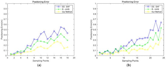 Comprehensive comparison of positioning errors: (a) positioning error results of indoor scene test I; (b) positioning error results of indoor scene test II.