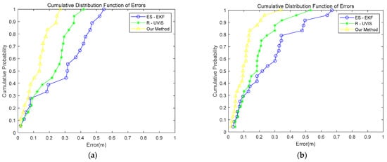 Cumulative distribution of positioning errors: (a) cumulative distribution diagram of test I; (b) cumulative distribution diagram of test II.