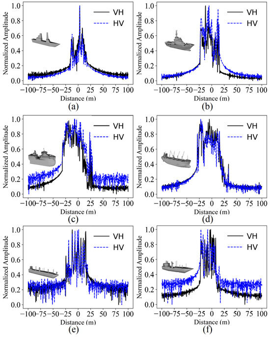Cross-polarization HRRPs of 6 ships at , (a) Ship 1; (b) Ship 2; (c) Ship 3; (d) Ship 4; (e) Ship 5; (f) Ship 6.
