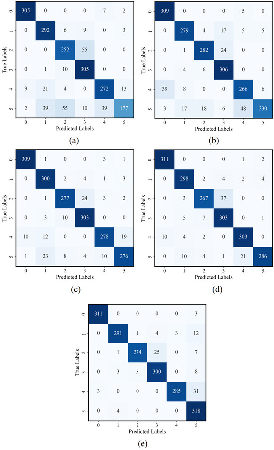 Confusion matrix of proposed method in full polarization: (a) 5 dB SNR (b) 10 dB SNR (c) 15 dB SNR (d) 20 dB SNR (e) Orignial dataset.