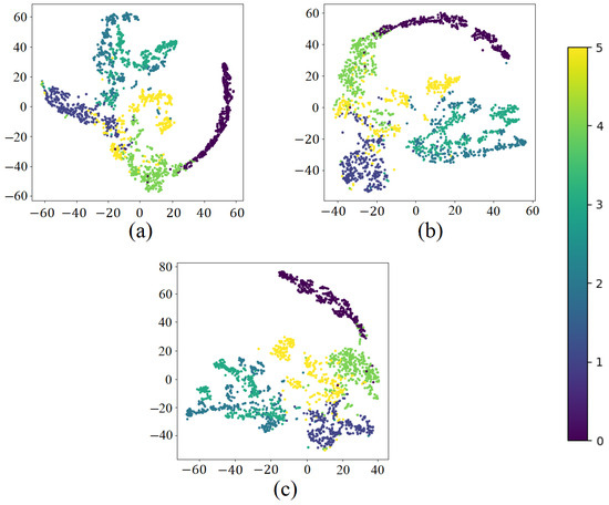 Two-dimensional t-SNE projection from extracted feature vectors with 6 classes of target. (a) LSTM (b) ConvLSTM (c) Proposed Method.