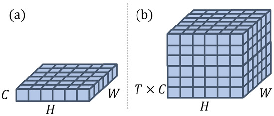 Given the input of a batch of past frames, , with batch size (where is the number of batches, is the number of frames, is the number of channels, and is the size of the image), which are decomposed to obtain the trend component and the seasonal component, respectively, the tensors with tensor reshape, , were input into the Trend network and Season network, respectively, as shown in Figure 2a. The inputs to both networks treat each frame as an individual sample and focus on single-frame level features without considering temporal changes. In the GSAM, the hidden representations of the encoder output were reshaped into tensors of shape , and multiple frame-level features were stacked along the time axis, as shown in Figure 2b. By forcing channel attention and spatial attention modules designed based on convolutional networks to learn from the multi-frame feature stack, the model can capture the inherent spatio-temporal evolution within the sequence data.