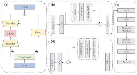 To predict the seasonal components, a Season network with an encoder–decoder structure was constructed, which includes an encoder (Figure 3b), a GSAM (Figure 3c), and a decoder (Figure 3d). The Season network utilizes an encoder to encode high-dimensional past frames into a low-dimensional potential space from which GSAM learns spatial dependencies and temporal variations. The decoder ultimately decodes the latent spatio-temporal information into predicted future frames. The design logic of the Season network can be detailed using the following formulas: