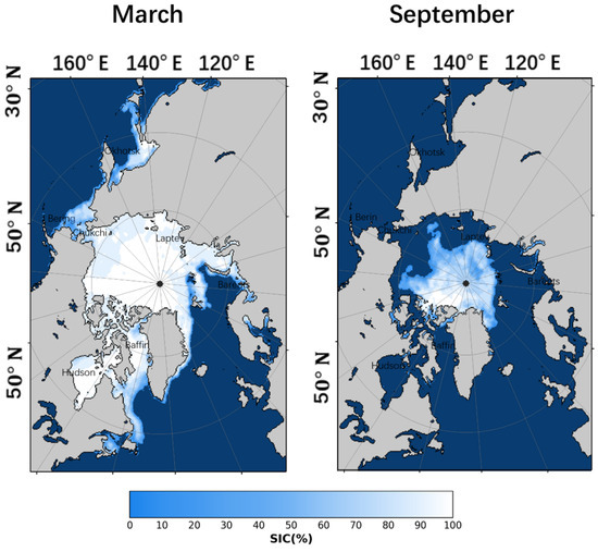 The daily SIC data used in this study were obtained from the Nimbus-7 SSMR and DMSP SSM/I-SSMIS passive microwave data versions provided by the NSIDC [59]. These data have a spatial resolution of 25 km and are based on an Arctic stereographic projection. The region of interest covers 448 × 304 grids. In each 25 km grid cell, SIC values below 15% detected by passive microwave instruments were set to 0% due to high uncertainty, with the remaining data ranging from 15 to 100%. A threshold of 15% was used as the critical minimum SIC. The dataset spans 35 years from 1988 to 2022, including a total of 12,772 days, avoiding potential errors due to inconsistent observation intervals in the data from 1978 to 1988. The parameters of the SIC data used in this study include a spatial resolution of 25 km, daily temporal resolution, and Arctic stereographic projection. Figure 6 shows two examples of SIC in March and September 2022, respectively. The average SIC in the study area exhibits significant seasonal fluctuations [48], indicating that the large-scale evolution of SIC is primarily influenced by seasonal changes. Overall, SIC reaches its maximum in March and its minimum in September.