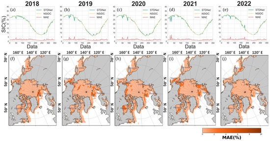 Performance of model test set: (a–e) 2018–2022 single-day, non-terrestrial, grid-averaged SIC true values (NSIDC); STDNet predicted values; and MAE. (f–j) 2018–2022 average spatial distribution of MAE of SIC predicted by STDNet.