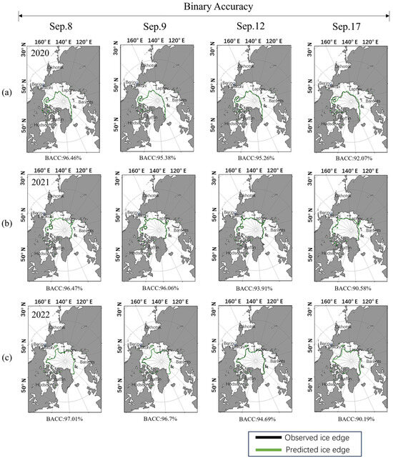 To explore why the MAE increased in the sea ice edge region, the sea ice edge was calculated based on the predicted value of SIC, and the proximity was assessed using the BACC metric [38]. As shown in Figure 7a–e, the sea ice concentration reaches its minimum in September. Predictions from 8 September to 17 September, 2018–2022, were selected for evaluation, and the results, covering the period from 2020 to 2022, are shown in Figure 8, where the observed ice edge is the black contour and the STDNet predicted ice edge is the green contour.