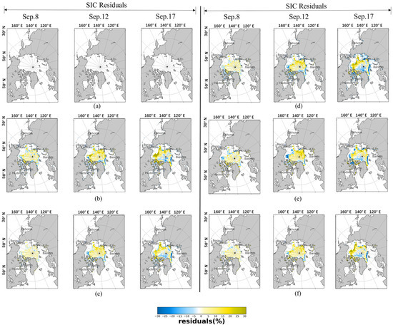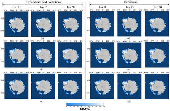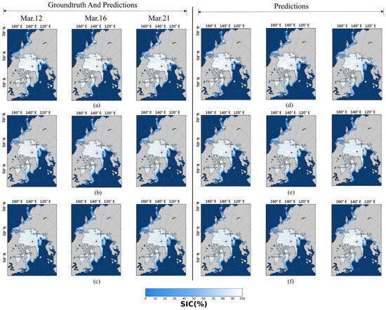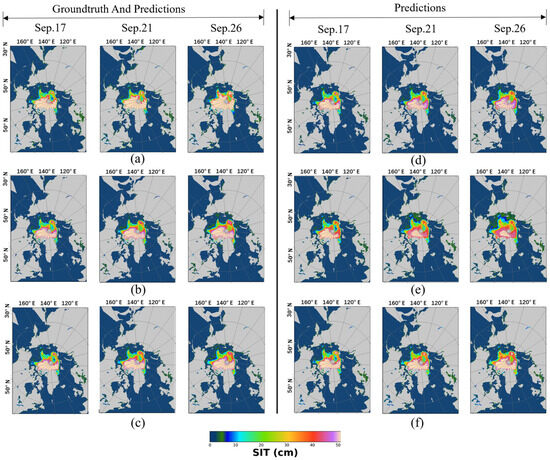 Comparison of the prediction performance of STDNet with selected methods on Arctic sea ice thickness between 17 September and 26 September: (a) NSIDC, (b) ConvLSTM, (c) PredRNN++, (d) PredRNNV2, (e) SimVP, and (f) STDNet.
