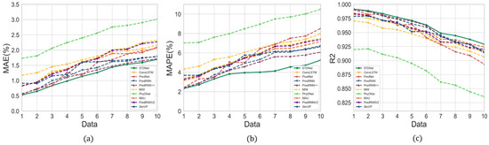 To comprehensively evaluate the prediction performance of STDNet, the following metrics were used: Root Mean Square Error (RMSE), Mean Absolute Error (MAE), Mean Absolute Percentage Error (MAPE), coefficient of determination (), and Binary Accuracy (BACC), and the formulas are as follows, respectively,