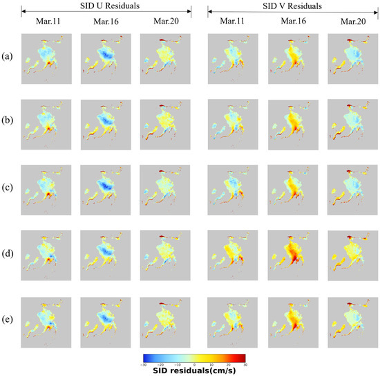 Residual distributions of sea ice drift u- and v-components predicted by selected models and real images from March 11 to March 20: (a) ConvLSTM, (b) PredRNN++, (c) PredRNNV2, (d) SimVP, and (e) STDNet.