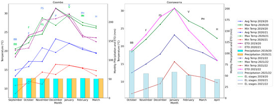 For both of the study sites, the daily potential evapotranspiration (ET0) was determined by the Penman–Monteith equation from the data of their respective weather stations. The weather–water balance (P − ET0) throughout the growing season was determined by subtracting the ET0 from the precipitation (P). Several phenological growth stages, as defined by the Eichhorn–Lorenz (EL) system, were selected for both sites. The EL system categorises grapevine growth into distinct stages, each identified by specific developmental milestones. The selected EL stages for both sites were as follows: EL 4 budburst (BB), EL 19 flowering (F), EL 27 fruit set (FS), EL 31 pea size (PS), EL 35 veraison (V), EL 37 preharvest (PH), and EL 38 harvest (H) for the vines. A detailed description of the EL stages can be found in Coombe [37]. The weather conditions at the Coombe and Coonawarra vineyards during the 2019/20, 2020/21, and 2021/22 growing seasons is shown in Figure 3. Data collection was carried out during these phenological stages.