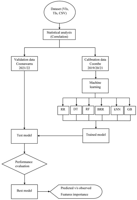 Data preprocessing included handling missing values, transforming outliers, and applying the Yeo–Johnson transformation for the normalisation. Dimensionality reduction was performed using the RFE with LASSO, PCA for feature extraction, and the elimination of variables with VIF > 10. Categorical variables were encoded using OneHotEncoder from sklearn (Scikit-learn, Python 3.9, Python Software Foundation, Wilmington, DE, USA). The RR, BRR, DT, RF, GB, and kNN models were implemented in Python 3.9 (Python Software Foundation, Wilmington, DE, USA) to predict the grapevine yield and berry composition parameters from the hyperspectral VIs, thermal indices, and canopy state variables. Coombe Vineyard data were used for the calibration and Coonawarra data were used for the validation. Data were scaled using the MinMaxScaler, and the model parameters were optimised via grid search and repeated 10-fold cross-validation. The best models were tested on the validation dataset, with the performance evaluated using the R2, RMSE, MAE, and MAPE. Predictor importance analysis identified the top 10 contributors, which were plotted together with the predicted vs. observed values.