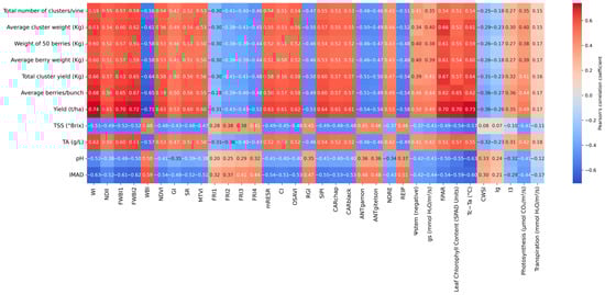 Correlogram of Pearson’s correlation coefficient between grapevine yield components, berry composition parameters, and independent variables; p < 0.05 for all cases.
