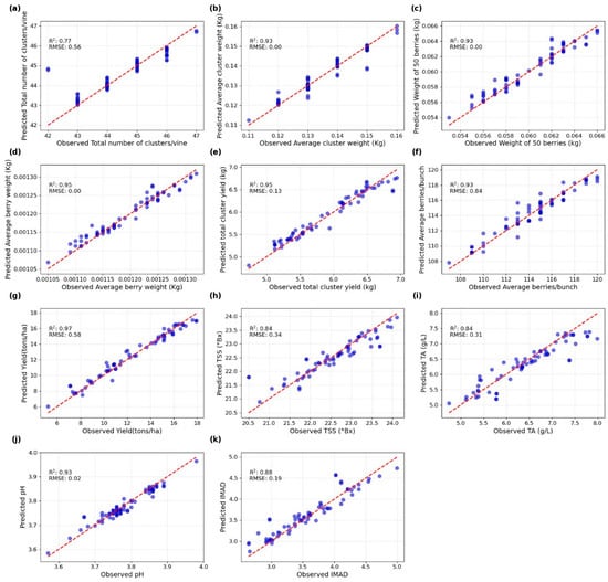 Observed versus predicted grapevine yield components and berry composition parameters using the best models identified in the validation. (a) Total number of clusters/vine, (b) Average cluster weight (kg), (c) Weight of 50 berries (kg), (d) Average berry weight (kg), (e) Total cluster yield (kg), (f) Average berries/bunch, (g) Yield (t/ha), (h) Total soluble solids (°Brix), (i) Titratable acidity (g/L), (j) pH (unitless), and (k) Maturity Index IMAD (unitless).
