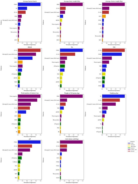 Predictor importance based on the best models for each of the predicted variables, showing the ranked bar charts for the normalised importance of the different categories of independent variables in the prediction of grapevine yield components and composition parameters. The independent variables were categorised as follows: ‘water’, in blue [‘WI’, ‘NDII’, ‘FWBI1’, ‘FWBI2’, and ‘WBI’]; ‘structure’, in orange [‘NDVI’, ‘GI’, ‘SR’, and ‘MTVI’]; ‘physiology’, in yellow [‘FRI1’, ‘FRI2’, ‘FRI3’, ‘FRI4’, and ‘mRESR’]; ‘pigment’, in green [‘CI’, ‘OSAVI’, ‘RGI’, ‘SIPI’, ‘CARchap’, ‘CARblack’, ‘ANTgamon’, ‘ANTgitelson’, ‘NDRE’, and ‘REIP’], ‘canopy state variables’, in purple [‘Ψstem (negative MPa)’, ‘gs (mmol m−2 s−1) ‘, ‘fiPAR’, ‘LCC (SPAD units)’, ‘Photosynthesis (μmol CO2 m−2 s−1)’, and ‘Transpiration (mmol H2O m−2 s−1)’]; ‘thermal’, in firebrick red [‘(Tc − Ta) in °C’, ‘CWSI’, ‘Ig’, and ‘I3’]. Chlorophyll Content (SPAD units) is the same as LCC (SPAD units). Some units were omitted from the figure due to space limitations but were included in the caption.