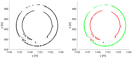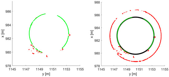 The images below present the graphical results of the RANSAC method. Figure 3 (left) shows the input data for the RANSAC method at an elevation of 234 m.a.s.l. At certain height intervals of the chimney (such as the 234 m.a.s.l.), there were cases where obstacles such as a fence or platform (represented by a larger black circle) were incorporated into the circle-fitting process alongside the chimney’s lateral surface (Figure 3 (left)). The same figure also shows a section with higher noise, most likely caused by multiple reflections of the laser beam from a metallic structure, such as a fence or platform. The reason why this only occurs at one station is related to the incident angle of the laser beam. Since the larger circle contains more points, an additional iteration of the RANSAC procedure was necessary, particularly for the data classified as outliers (red) in the first iteration (Figure 3 (right)). Figure 4 (left) shows the results of the second iteration of the RANSAC method, where red points indicate outliers and green points represent inliers. Figure 4 (right) shows the final result of the chimney shell analysis at a specific height. The red points indicate all the outliers, the green points represent all the inliers, and the black circle represents the fitted circle calculated using the LS method on the inliers.