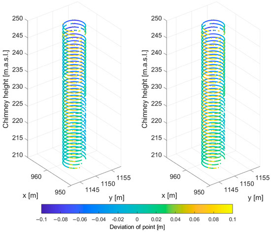 Compared to previous methods, we found several advantages of looking at individual height bands in combination with the RANSAC method to determine the non-verticality of chimneys and other tall structures. By treating individual bands of point clouds representing cross-sections of the chimney shell and treating them at selected height intervals, we can calculate the parameters of the chimney shell centre and the corresponding radius or ellipse semi-axes. These solutions apply to cases where the chimney shell is cylindrical. The main advantage of the RANSAC method when dealing with height bands is that it filters out points that do not represent the surface in the chimney shell in a single step, thus eliminating the influence of gross measurement errors on the results. Additionally, the parameters of the chimney shell are calculated using the LS method based on the filtered point cloud. In our research, we want to demonstrate that the RANSAC method is useful and necessary when anomalies are present on the chimney shell. Another important advantage relates to the mathematical background. The cross-section of the chimney shell is usually circular or elliptical, while other tall objects may have shapes such as rectangles, squares, etc., which are mathematically well-defined figures with respect to the band treatment. However, when treating an object as a whole, difficulties may arise in the mathematical description of such an object, especially for more complex structures (e.g., cooling towers, television towers, etc.). Using the results at all height levels, we can approximate a curve through the calculated centre points, allowing us to analyse whether the chimney shell is tilting (linear function) or whether the structure is possibly deformed (curve). To better visualise the deviation points from the theoretical cylinder and thus demonstrate the non-verticality of the chimney stack shell, each individual point can be coloured according to its distance from the vertical cylinder.