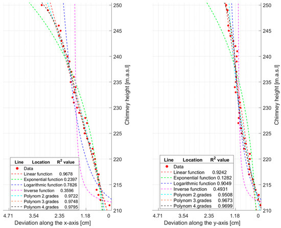 We translated the deviations to the coordinate origin (0, 0) and exchanged the coordinate axes in order to observe how the deviation along the x- or y-axis changes with increasing height. The optimum result is determined by minimising the sum of the squares of the point deviations from the curve. To assess the appropriateness, it is important to calculate the values of the sum of squares (SSE), total sum of squares (SST), and the coefficient of determination () [39].