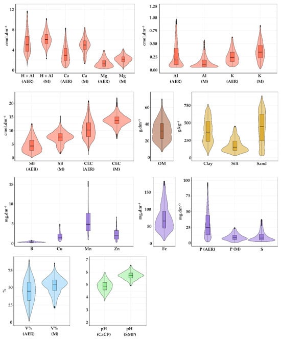 Organic matter content exhibited substantial variability or standard deviation (SD) (SD = 20.64 g.dm−3), indicating diverse soil organic compositions across samples. Soil pH, measured in CaCl2 and SMP, showed relatively low variability (SD = 0.47 and 0.32, respectively), with values generally ranging between 5 and 6, suggesting slightly acidic conditions. Notably, the AER method yielded higher variability in several properties compared to the M method, particularly for H + Al (SD_AER = 29.76 cmolc.dm−3 vs. SD_M = 1.66 cmolc.dm−3) and exchangeable cations such as Ca (SD_AER = 22.46 cmolc.dm−3 vs. SD_M = 1.59 cmolc.dm−3) and Mg (SD_AER = 11.39 cmolc.dm−3 vs. SD_M = 0.82 cmolc.dm−3). Phosphorus availability differed markedly between methods, with AER extracting higher and more variable concentrations (SD_AER = 36.66 mg.dm−3 vs. SD_M = 13.11 mg.dm−3). The cation exchange capacity (CEC) showed high variability (SD_AER = 42.93 cmolc.dm−3, SD_M = 44 cmolc.dm−3), reflecting diverse soil textures, further evidenced by the considerable variation in clay (SD = 170.8 g.kg−1), silt (SD = 103.34 g kg−1), and sand (SD = 224.64 g.kg−1) contents.