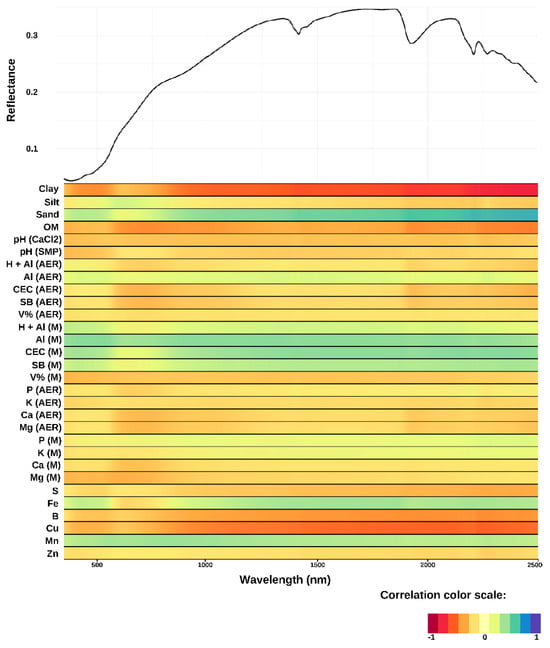 To show the strength and direction of linear relationships between several soil properties and their medium spectrum, a Pearson correlation plot was used (Figure 3). In this plot, each soil property is represented along the Y axis, with colored cells indicating correlation values between the property and the spectrum in the X axis.