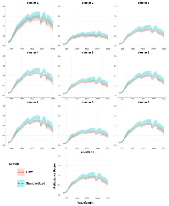 Figure 4 shows the mean and standard deviation of the VIS-NIR-SWIR spectra for the entire database, grouped into 10 clusters based on spectral similarity. While each cluster exhibits a unique spectral signature, similarities can be observed, particularly in the VIS and NIR regions. The spectra display typical soil absorptions, as noted in previous studies, at 400–600 nm, 1100 nm, 1400 nm, 1800–2000 nm, and 2200–2400 nm [30]. Absorptions in the visible range (400–780 nm) are linked to iron-containing minerals like hematite and goethite, though chromophores and organic matter can also cause absorption in this range [34].