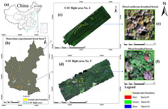 Overview map of the study area: (a) location of Heilongjiang Province in a map of the administrative areas of China; (b) aerial view of Maoershan Experimental Forest Farm, the numbered areas numbered 1, 2, 3, 4, and 5 are drone flight zones.; aerial views of unmanned aerial vehicle (UAV) flight area Nos. 4 (c) and 5 (d); and aerial photos of (e) mixed coniferous–broadleaf forest and (f) mixed broadleaf forest.