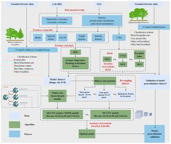 The experimental process in this study mainly included three steps: (1) combining a semantic segmentation algorithm (i.e., U-Net or Deeplab V3 plus) with a WST algorithm for individual tree crown detection; (2) comparing the effectiveness of the 3D-CNN models (i.e., ResNet10, ResNet18, ResNet34, ResNet50, and VGG16) for individual tree species classification in the dense mixed coniferous and broad-leaved forests; and (3) resampling the original image (i.e., 8 × 8 pixels) dataset to different pixel densities (i.e., two times (16 × 16 pixels), four times (32 × 32 pixels), and eight times (64 × 64 pixels) the original number of pixels) for the input patch size in a series of 3D-CNN models. Then, an MSFB (i.e., different numbers of pixels at the same input patch size) in combination with CNN models with multi-scale information were proposed to participate in the decision-making of tree species classification. The overall experimental flowchart is shown in Figure 2.