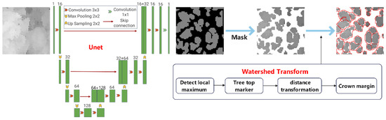 Individual tree crown delineation (ITCD) is a prerequisite for various methods of object-oriented tree species classification [31,32,33]. According to the input data, ITCD methods can be categorized into point cloud (e.g., comparative shortest-path) [34] and canopy height model (CHM)-based segmentation methods [35,36]. Over the past two decades, various ITCD algorithms have been developed to improve model accuracy, such as the watershed transform (WST) [37], region-based hierarchical cross-section analysis [38], and the use of a hierarchical region merging algorithm [39]. Faced with relatively complex forest conditions (e.g., closed hardwood forests and natural secondary forests), traditional crown segmentation methods have the following limitations: they rely on fixed parameters and lack an adaptive adjustment mechanism, making it difficult to find a set of universal parameters that can be used to stably segment the complex and intertwined individual tree crowns [40]. In recent years, the development of semantic segmentation technology (e.g., u-shaped network (U-Net)) [41] in deep learning (DL) has brought new possibilities to the task of tree crown segmentation. Semantic segmentation methods can effectively provide contextual information from images and have learning capabilities [42]. In complex environments such as where the segmented objects are irregular and highly overlap, semantic segmentation methods can perform better than traditional methods [43]. However, semantic segmentation methods have difficulty distinguishing connected individual tree crowns in forests with high canopy density. Therefore, combining semantic segmentation with traditional segmentation algorithms may be an optimal solution for the task of stable and efficient individual crown detection in complex secondary forests.
