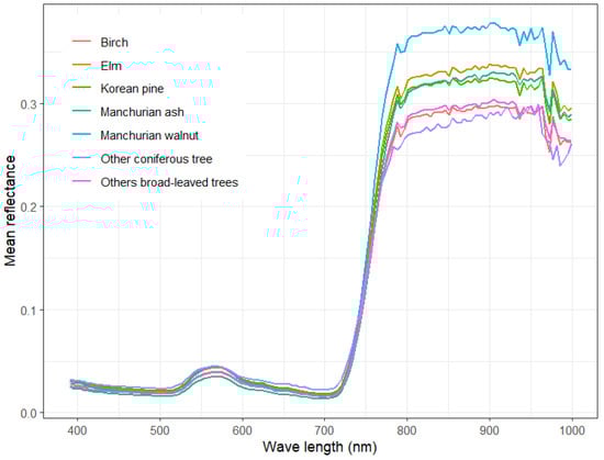 Mean spectral reflectance curves of seven tree species groups: birch, elm, Korean pine, Manchurian ash, Manchurian walnut, other coniferous trees, and other broadleaf trees.