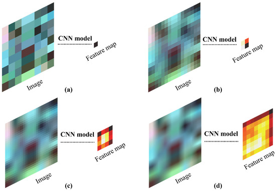 Relationship between tree crown images of different pixel densities and feature map sizes obtained by the convolutional neural network model; the original images were resampled to different pixel densities: (a) 8 × 8 pixels, (b) 16 × 16 pixels, (c) 32 × 32 pixels, and (d) 64 × 64 pixels.