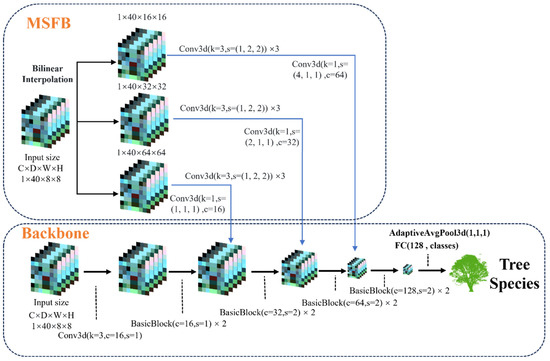 When applying 3D-CNN models, images with a higher pixel density can enable the convolutional models to obtain a larger receptive field and retain more feature map information for tree species classification decisions, thereby improving the model accuracy. The ResNet18 model outperformed the other four models at all pixel densities and exhibited a superior performance (OA: 0.916) when the number of pixels increased eight times (64 × 64 pixels). Additionally, the incorporation of the MSFB, which combines information from different scales with the main model through multiple branch structures, effectively increased the OA of the five 3D-CNN models by approximately 0.04 and significantly lowered computational complexity (8× reduction in FLOPs compared with the resampled dataset at better or similar accuracies). This balance between accuracy and computational resource requirements makes it feasible for large-scale spatial application. The tree crown segmentation and tree species classification methods developed in this study also performed well in mixed broadleaf forests, providing support for large-scale forest resource management, conserving biodiversity, and assisting in forest resource inventories.