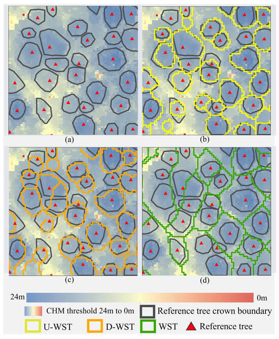 Individual tree crown delineation results of three algorithms with a 15 × 15 m plot: (a) the reference tree crown; the results of the (b) U-WST, (c) D-WST, and (d) WST algorithms. Note: CHM, canopy height model.