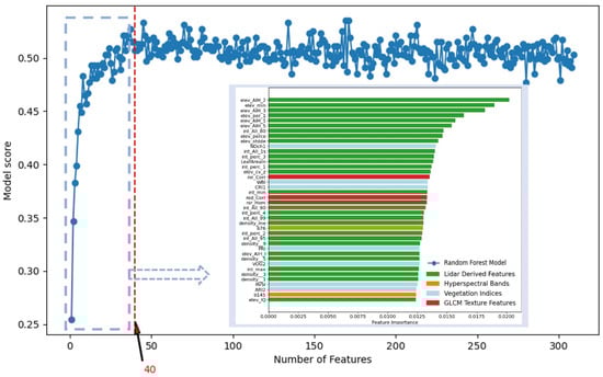 Figure 8 shows the relationship between the number of features and the model score of the RFE algorithm (i.e., RF classifier). Combining the RFE curve and 3D-CNN model parameter settings, 40 features (although the 40 features selected may still seem relatively large compared to traditional machine learning tasks, 3D CNNs are well-suited to handle such complex multidimensional data) were finally selected to participate in tree classification. The most important 40 features (depicted in Figure 8) comprised 28 lidar-related and 12 spectral-related features out of the total of 301 features obtained by the RF importance ranking method. Among them, the lidar-related features were more important than the spectral-related features. The 12 spectral-related features comprised two of the original hyperspectral bands (i.e., b76 and b145 correspond to the reflectance characteristics at wavelengths of 760 nm and 1045 nm, according to Figure 4, and roughly represent the separation and descending inflection points of the spectral reflectance curve), three gray level co-occurrence matrix features (i.e., nir_corr, red_corr, and nir_hom), and seven vegetation index features (the specific feature names are provided in the Supplementary Data).