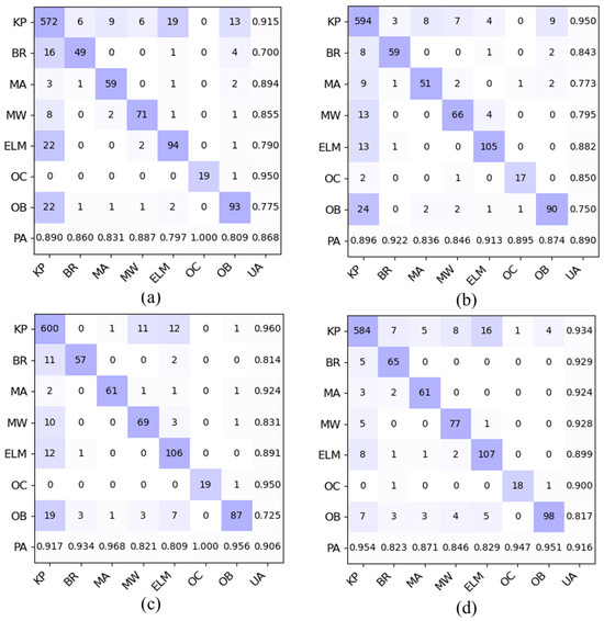 Confusion matrix of the ResNet18 model at four pixel densities: (a) 8 × 8 pixels, (b) 16 × 16 pixels, (c) 32 × 32 pixels, and (d) 64 × 64 pixels. Note: PA represents Producer’s Accuracy, UA represents User’s Accuracy, KP represents Korean pine, BR represents birch, MA represents Manchurian ash, MW represents Manchurian walnut, OC represents Other coniferous trees, OB represents Other broad-leaved trees, the intensity of the color represents the magnitude of the value.