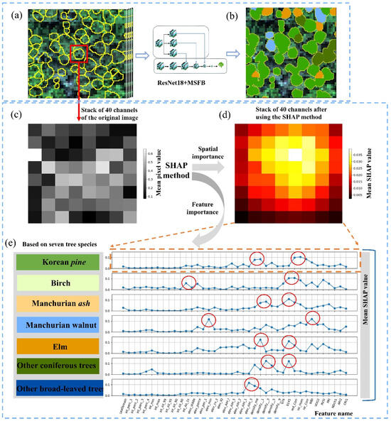 Spatial importance and feature importance based on the Shapley Additive exPlanations (SHAP) method: (a) tree crown segmentation; (b) tree species classification; (c) a stack of 40 channels of the original image; (d) a stack of 40 channels after using the SHAP method; (e) SHAP feature importance based on seven tree species groups.
