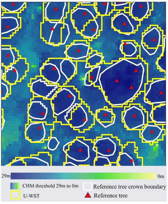 Performance of the U-WST algorithm in identifying tree canopies in mixed broadleaf forests. Note: CHM, canopy height model.