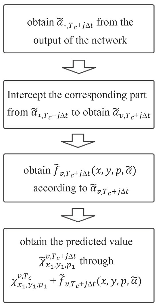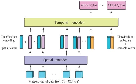 For clarity and convenience, we utilize the symbols listed in Table 1 to represent the variables in five-dimensional meteorological data. We append a tilde (∼) to the corresponding symbol to denote the predicted values. The objective of our study is to utilize known regional meteorological data from past time points to predict the unknown data of the same region at future time points. Assuming the current time point is , we sample previous data points at a fixed time interval and employ the algorithm to predict J future data from , also with a time interval of . The entire prediction process can be summarized as follows: