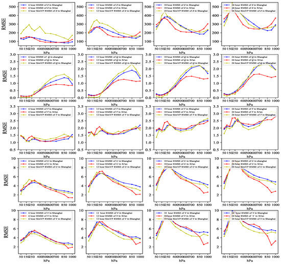 Figure 4 showcases the detailed variation in RMSE for multiple meteorological variables across different prediction time intervals and pressure levels. The behaviors of prediction results at different atmospheric pressures reveal complex, non-linear trends. For variable Z, the RMSE initially shows a sharp increase as pressure decreases, peaking at approximately 200 hPa, indicating a significant deviation in predictions at higher pressures. After this peak, the RMSE gradually declines, stabilizing between 600 hPa and 850 hPa, representing more accurate predictions in this mid-level pressure range. However, a slight increase is observed again as the pressure decreases further. The RMSE of variable Q follows a somewhat similar trend, starting with a moderate rise in RMSE. After reaching its maximum between 600 hPa and 850 hPa, it shows a clear decline as the pressure decreases, suggesting a more stable predictive accuracy in both lower and higher pressure ranges. In the case of variable T, the RMSE exhibits a relatively consistent upward trend as pressure decreases, with a noticeable local maximum occurring between 250 hPa and 400 hPa. This behavior suggests that the prediction error increases more steadily for T compared to other variables at higher pressures. Variables U and V exhibit very similar patterns in their RMSE curves, characterized by an initial increase followed by a steady decline. Both variables show their highest RMSE values in the range between 150 hPa and 400 hPa, corresponding to higher pressures. However, their predictive accuracy improves significantly at lower pressures, with minimum RMSE values observed between 850 hPa and 1000 hPa. Overall, the figure highlights how different meteorological variables exhibit unique relationships between prediction errors and pressure levels, with the mid- to high-pressure regions showing more variability in RMSE patterns.