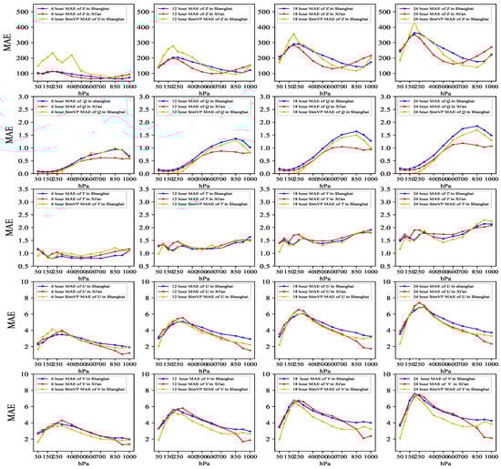 Figure 5 illustrates the variations in MAE for different variables and prediction time points of SA-Fit prediction results with respect to pressure levels. The variation patterns of MAE in the prediction results are largely consistent with those of RMSE. The prediction results for meteorological variables at different pressure levels demonstrate inconsistency and the relationship between variables and pressure levels exhibits variations. For variable Z, the MAE initially increases, reaching a peak around 200 hPa, followed by a decrease until reaching a pressure level between 600 hPa and 850 hPa, and subsequently increasing again. Variable Q exhibits an initial increase in MAE, followed by a decrease, and reaches its maximum at pressure levels between 600 hPa and 850 hPa. For the variable T, MAE typically increases with increasing pressure levels, with a local maximum value between 250 hPa and 400 hPa. Variables U and V exhibit similar patterns of MAE changes, characterized by an initial increase, and subsequent decrease. The maximum MAE for both variables is observed between 150 hPa and 400 hPa, while the minimum MAE is observed between 850 hPa and 1000 hPa.