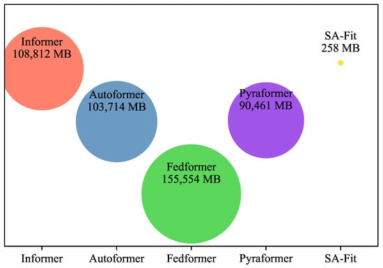 Due to the use of the spatiotemporal analysis network, SA-Fit can process and predict high-dimensional meteorological data simultaneously through the improved curve fitting algorithm. The number of parameters in SA-Fit is not affected by the scale of the data to be predicted. The previous Transformer-based time series prediction methods could only predict time series with a single spatial coordinate. When dealing with multiple time series in high-dimensional space, multiple prediction models need to be constructed. As the data scale continues to increase, the computational resources required to construct models become unacceptable. Table 6 shows the model size required by different algorithms, and it is evident that SA-Fit has significantly fewer parameters when predicting meteorological data in the Shanghai region. We have visually demonstrated the advantage of SA-Fit in terms of model size in Figure 6. In fact, using methods like FEDformer to simultaneously predict data for all spatial coordinate points in a given area on a typical consumer-grade graphics card is not feasible, as the GPU memory does not support such operations.