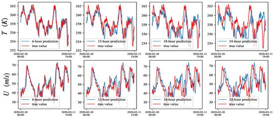 Predicted values for different hours and true values of T and U from 2020-02-20 00:00 to 2020-03-11 19:00 at a longitude of 121.25°, latitude of 30.75°, and pressure level of 500 hPa in the Shanghai region.