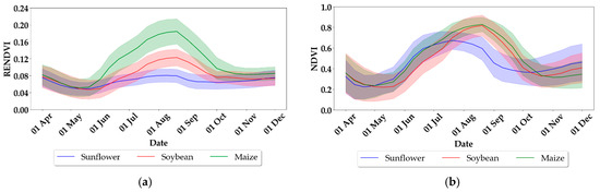In this study, we used Sentinel-2 (S2) Level-2A (L2A) products from the Sentinel-2A and Sentinel-2B satellites, available through the Google Earth Engine (GEE) [45]. The L2A products represent bottom-of-atmosphere (BOA) reflectance, which has undergone atmospheric correction to remove the effects of gasses and aerosols in the atmosphere, using ESA’s Sen2Cor processor [25]. This correction ensures that the reflectance values more accurately represent surface conditions. Additionally, terrain correction was applied to minimize topographic effects on reflectance. For cloud masking, we used the quality assessment band (QA60) to filter out cloudy and shadowed pixels, ensuring that only clear observations contributed to the analysis. This step is crucial to enhance the reliability of the time series and prevent cloud contamination in vegetation indices and other analyses. The potential gaps resulting from clouds were consequently mitigated using a gap-filling technique consisting of fitting and resampling the data. The Sav-Gol function was used for fitting with a window length of 3 [17]. The data were resampled to one point every 10 days, ensuring that there was enough repeatability to follow the rapid development of the summer crop, especially during its vegetative growth stage. We created the S2 time series for Tarbes (2020 and 2021) and Dijon (2020), covering the entire growth period of the three selected summer crops: sunflower, soybean, and maize (1 April to 1 December). Our S2 dataset contained 41 images in 12 bands for each study site/year. This study was conducted at the field level, so for each band, the mean pixel value was calculated for each field.