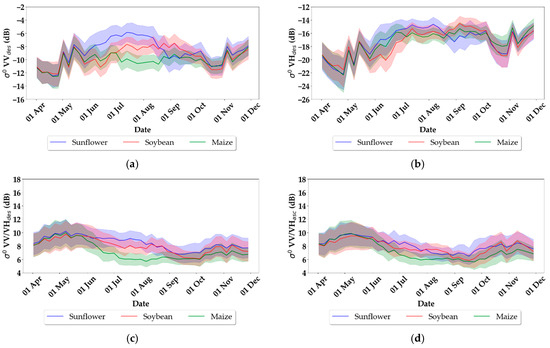 Remote sensing data serves as a key tool for large-scale monitoring of land surfaces and crop mapping. Optical imagery is particularly valuable for crop mapping because it captures detailed information about crop growth and health through multiple spectral bands that are sensitive to different stages of plant development [5,6,7,8,9,10]. However, optical data have limitations, particularly in regions with frequent cloud cover or haze, which can disrupt continuous data collection over time. In addition, since optical imagery often targets key stages of crop growth, it is more susceptible to weather-related disruptions during these stages [1,11]. In contrast, radar data are particularly advantageous in regions with frequent cloud cover, where optical sensors face significant challenges. Radar data can also penetrate vegetation and provide structural details that are especially useful for mapping crops like sunflowers [12]. However, studies have shown that, in general, radar data tends to provide lower classification accuracy compared to optical data [5,13,14]. Most studies using radar data focus on backscattering coefficients (VV, VH, and the VV/VH ratio), which offer valuable information for crop classification [15,16,17]. However, few studies have explored the use of radar polarimetric parameters. This is largely due to the fact that Sentinel-1 (S1) images, which are free accessible radar images, are not fully polarimetric, and the polarimetric parameters derived from dual-polarization data are less informative compared to those obtained from fully polarimetric synthetic aperture radar (SAR). Additionally, calculating polarimetric parameters can be time consuming, especially when dealing with time series data across multiple study sites or phenological cycles. However, certain polarimetric parameters, which capture backscattering mechanisms and wave interactions, may be highly sensitive to changes in crop phenology, offering valuable insights into crop growth stages [18,19].