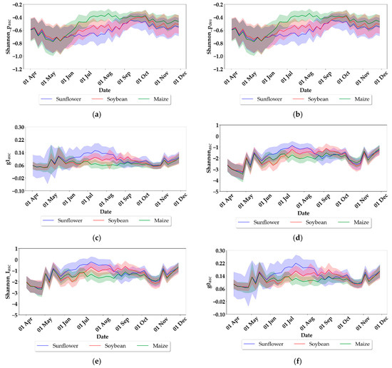 Polarimetric SAR data capture detailed information about the polarization amplitude and phase of the radar signal which can be useful for crop detection. As crops develop, there is not only an increase in radar backscatter but also a greater variability in scattering patterns, along with increased contributions from multiple or volume scattering [18]. This variability suggests that certain polarimetric parameters, which capture backscattering mechanisms and wave interactions, may be particularly sensitive to changes in crop phenology, offering valuable insights into crop growth stages. Therefore, we calculated several polarimetric parameters for this study. S1_SLC images were downloaded from NASA’s Earth Observing System Data and Information System (EOSDIS, https://search.asf.alaska.edu, accessed on 11 April 2024). All preprocessing steps to derive polarimetric parameters were conducted using ESA’s Sentinel Application Platform (SNAP) v.7.0.0 and PolSARpro v.6.0. These steps included applying orbit files, performing Terrain Observation with Progressive Scans (TOPS) splitting, radiometric calibration, TOPS debursting, polarimetric speckle filtering, and terrain correction. Five polarimetric parameters were used in this study, including two Stokes parameters including g0 and g1 and three Shannon entropy-based polarimetric decomposition parameters: Shannon_I, Shannon_P and Shannon. The Stokes parameters describe the scattering from a partially polarized electromagnetic field and capture all the polarimetric information [19]. The first Stokes parameter (g0) represents the total intensity of the radar backscatter, while g1 indicates the polarized part of the electromagnetic field [18]. Shannon entropy parameters measure the randomness of the scattering process [18]. Shannon entropy is computed using the covariance matrix (Equation (1)). This polarimetric parameter can be expressed as the sum of two components including Shannon_I and Shannon_P, representing randomness associated with changes in signal intensity and phase, respectively [18] (Equations (2) and (3)).